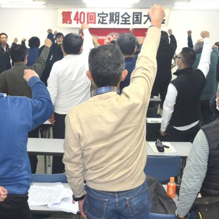 まず岡邨支部長がマイクを握り、「市の通告に対して2・3関西集会で3・18全国総決起集会を呼びかけた。八尾北労組を解体し住宅から追い出し、西郡を更地にして大資本に売り渡す。これこそ被災地の『復興特区』攻撃であり橋下の道州制攻撃だ。八尾北・西郡決戦に資本家どもとその手先―野田政権や橋下、田中八尾市政を引きずりこみ、道州制・非正規化・更地化の新自由主義を打ち倒す」と宣言。そして「八尾市の労働者を強