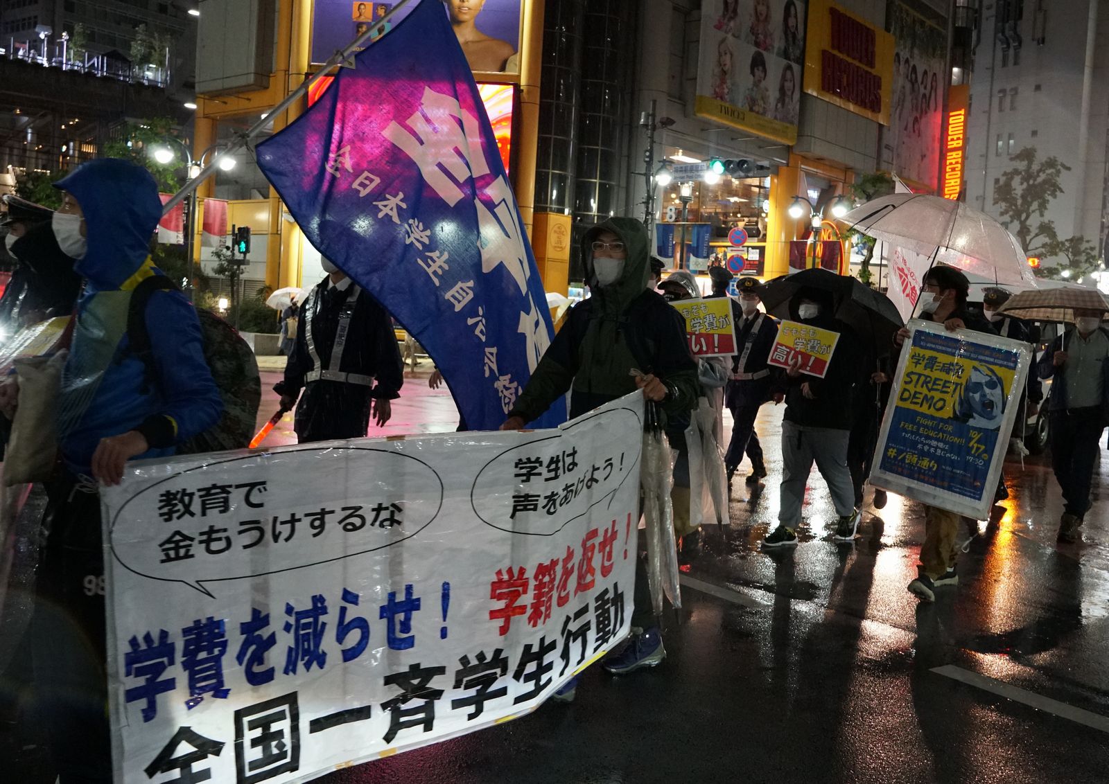 全学連の呼びかける「学費減免STREET DEMO」の「東西統一行動 EAST」が10月17日夕方、東京・渋谷で行われた。