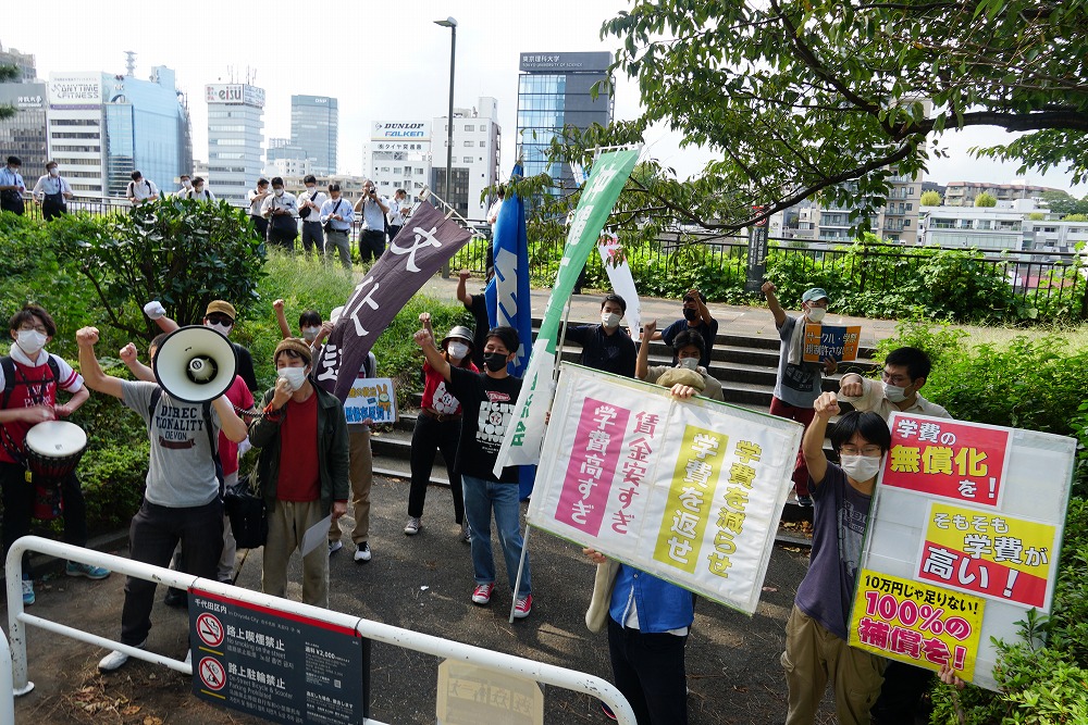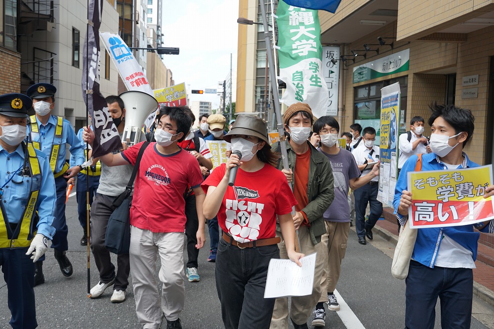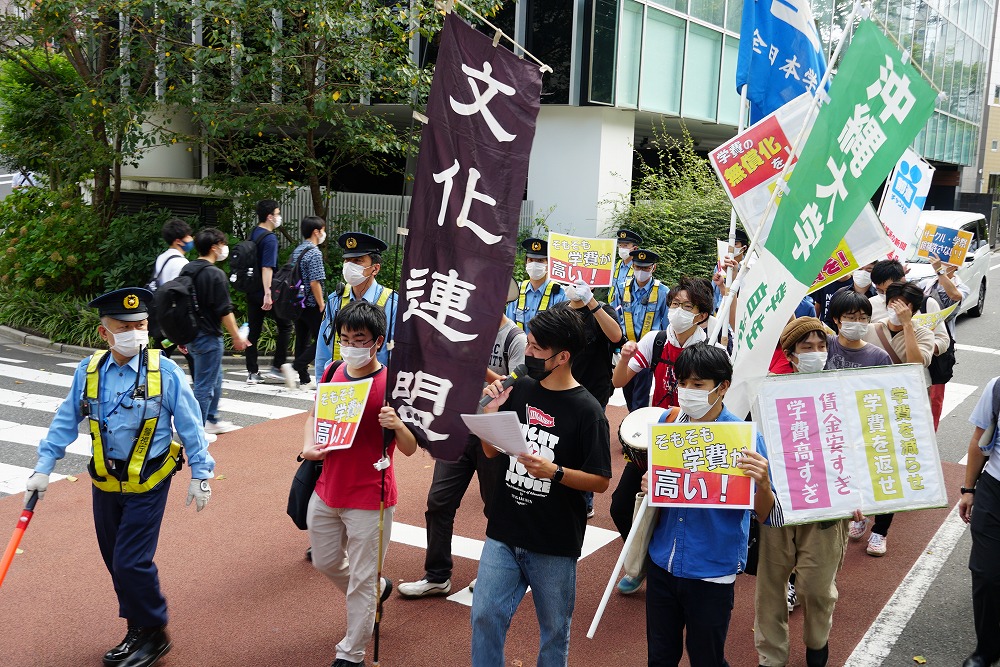 法政大学文化連盟と全学連が呼びかける「法大×私大連盟包囲デモ」が10月6日、法政大学市ヶ谷キャンパスで行われた。