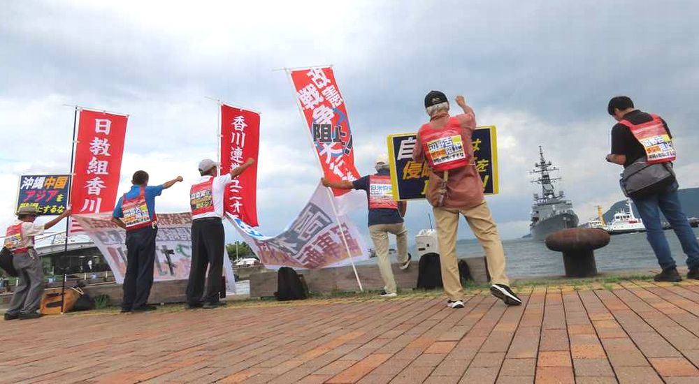 日本帝国主義は9月26日、中国侵略戦争の一環として、海上自衛隊の護衛艦「いなづま」の高松港への入港を強行しました。改憲・戦争阻止!大行進香川はこれを迎え撃つべく、当日の午前10時から高松港の5万㌧級岸壁に7人で集合しました。
