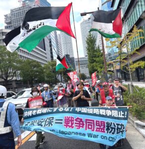 改憲・戦争憲阻止!大行進東海に結集する愛知、三重、岐阜の仲間は、パレスチナ蜂起2周年を前にした9月28日、4本のパレスチナ旗を掲げて参加したアラブ未来協会の仲間とともに、アメリカ領事館(名古屋国際センター)に向けた反戦デモで名古屋市内を席巻しました。