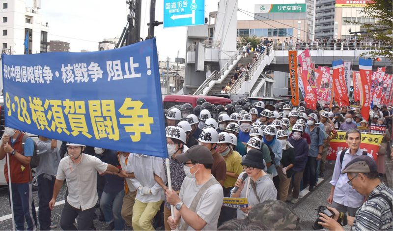 神奈川県横須賀市で9月28日、改憲・戦争阻止!大行進神奈川などの共催で「米日の中国侵略戦争・核戦争阻止!横須賀を核攻撃の出撃拠点にするな」と訴えるアピール行動とデモが230人の結集で勝ち取られました。侵略戦争・核戦争を阻む決意と熱意にあふれ、学生、青年、女性を先頭に多くの仲間がヘルメットをかぶりスクラムを組み、沿道の注目をあびながら、米海軍横須賀基地ゲートに迫る実力デモを貫徹しました。