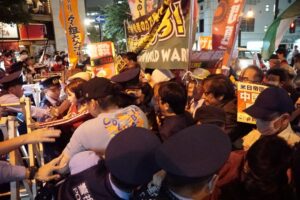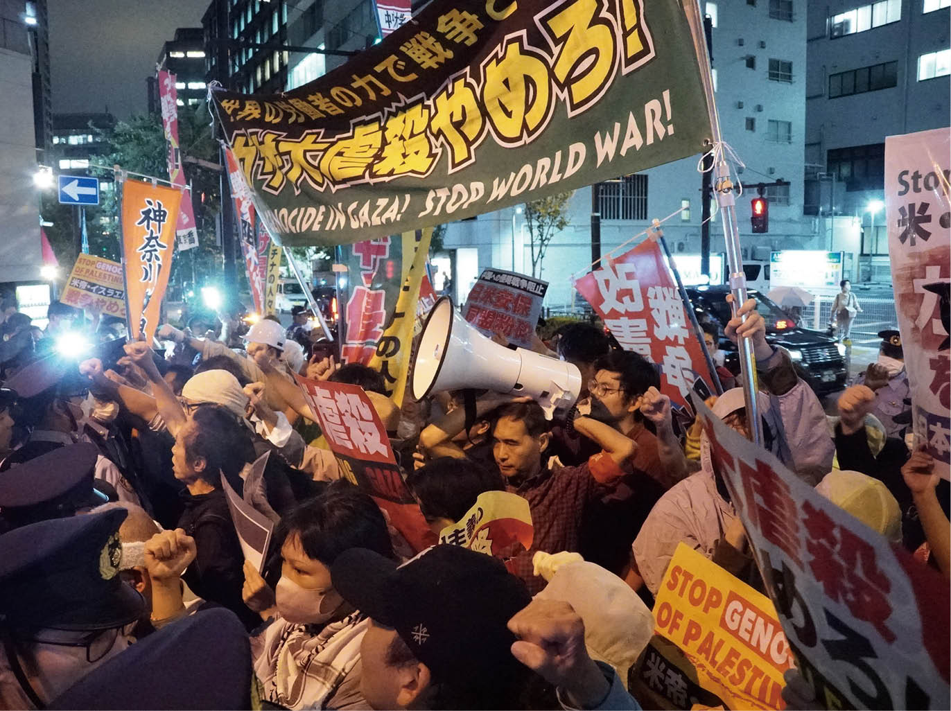 行く手を阻む警官隊にデモ隊の怒りが爆発し、激しくぶつかり合った。激突のさなかにも学生がマイクを握り、「大虐殺を絶対に許さない。イスラエルを支援する米日帝国主義を許さない。パレスチナ人民の解放闘争と固く連帯し、帝国主義打倒へ闘おう」と怒りと決意を込めて訴えた。
