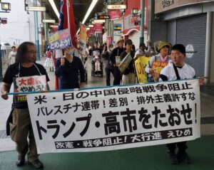 10月19日、「改憲・戦争阻止!大行進えひめ」は松山反戦・反差別デモを行いました。県内から25人が参加しました。百貨店前の集会では愛媛県職労や解雇撤回を闘う女性労働者、原発廃炉を訴える県庁前行動の仲間などが発言。ガザ大虐殺と破壊への怒り、全米で起こった反トランプデモへの連帯、松山空港の「特定利用空港」への指定反対や、「改憲・核武装・天皇制賛美の高市を倒そう」と訴えました。