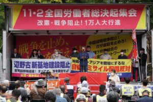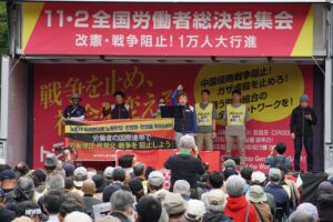 11・2全国労働者総決起集会&改憲・戦争阻止!1万人大行進が11月2日、東京・芝公園に2150人を結集して闘い取られ、中国侵略戦争阻止―高市政権打倒へ号砲を上げた。10月28日の日米首脳会談でトランプとともに「日米同盟の新たな黄金自体を共につくる」とぶち上げて戦争に突き進む高市は、防衛費のGDP比2%化を前倒し達成するための補正予算をはじめスパイ防止法など、今臨時国会で戦争体制を構築するための反動法案を一気に押し通そうと狙っている。11・2労働者集会はこれと対決する労働者人民の強固な闘争陣形を打ち固めた。