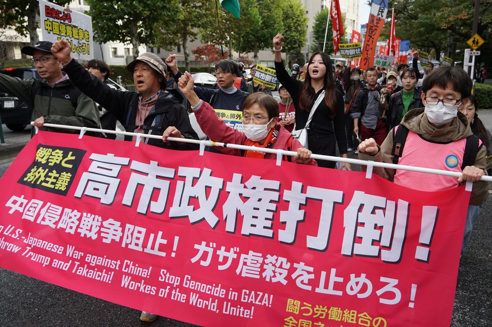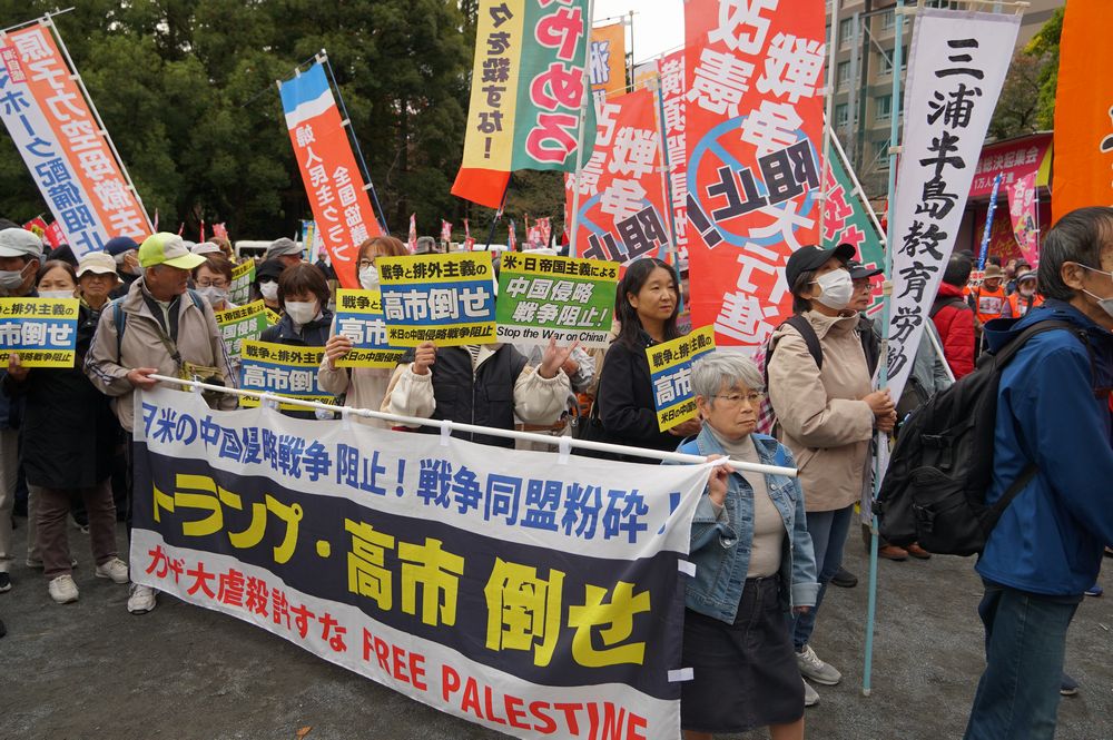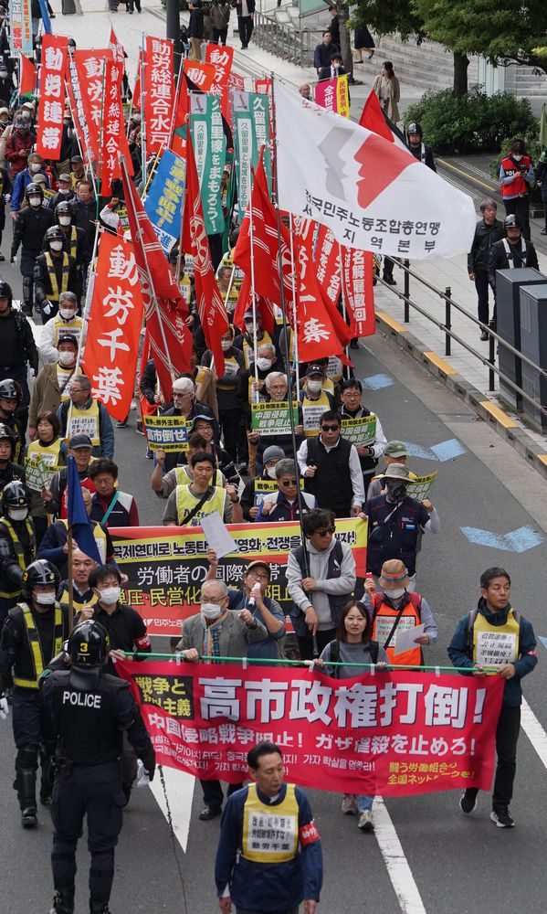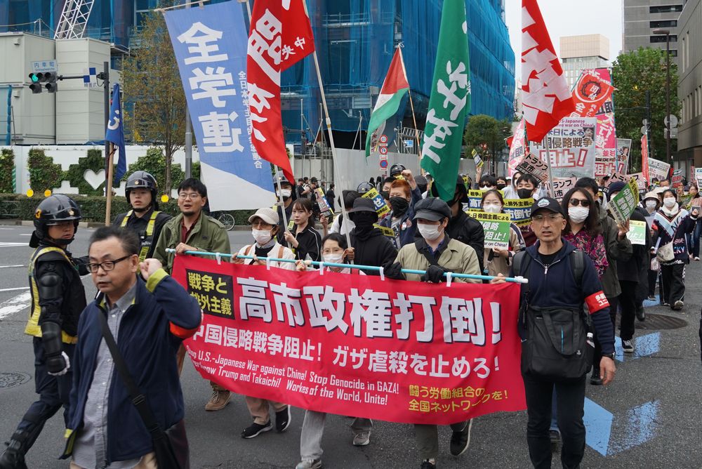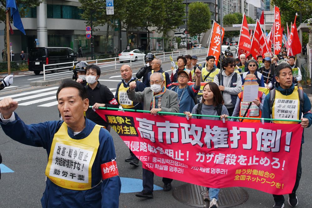 集会後は芝公園から新橋駅を経て日比谷公園に至るデモが行われ、「トランプ・高市打倒」「日米戦争同盟粉砕」「中国侵略戦争阻止」の声を響かせた。力強く進むデモ隊は沿道から注目され、熱い共感を集めた。
