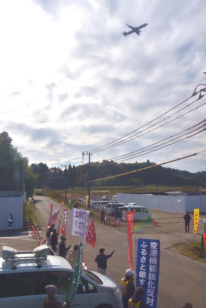 東関道の付け替え道路上下線を自動車が往来し、その向こうでトンネル化工事が進められているのが見渡せる。頭上40メートルにはジェット機が飛来しB滑走路に降り立っていく。ものすごい騒音だ。この現状に怒りをかき立て、「空港拡張実力阻止/工事強行許すな!」と大書された横断幕を広げシュプレヒコールを上げた。
