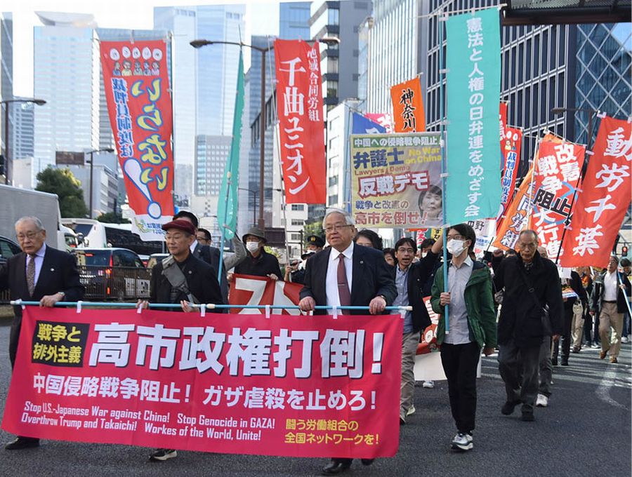 11月14日、闘う弁護士が先頭に立ち東京・霞が関の官庁街を貫く反戦デモを闘った。「憲法と人権の日弁連をめざす会」など3団体が呼びかけ、高市の「台湾有事は存立危機事態」発言に対して即座に怒りの反撃をたたきつけた。