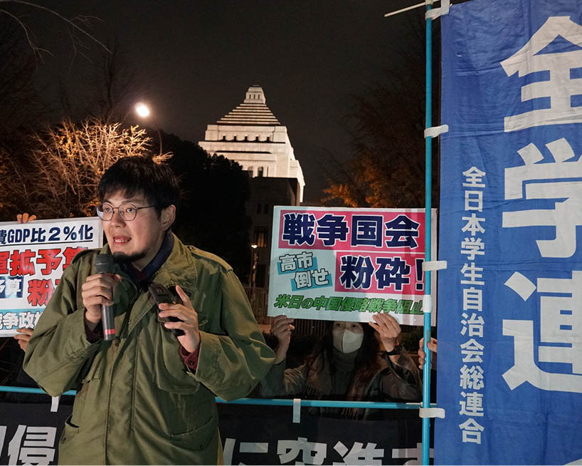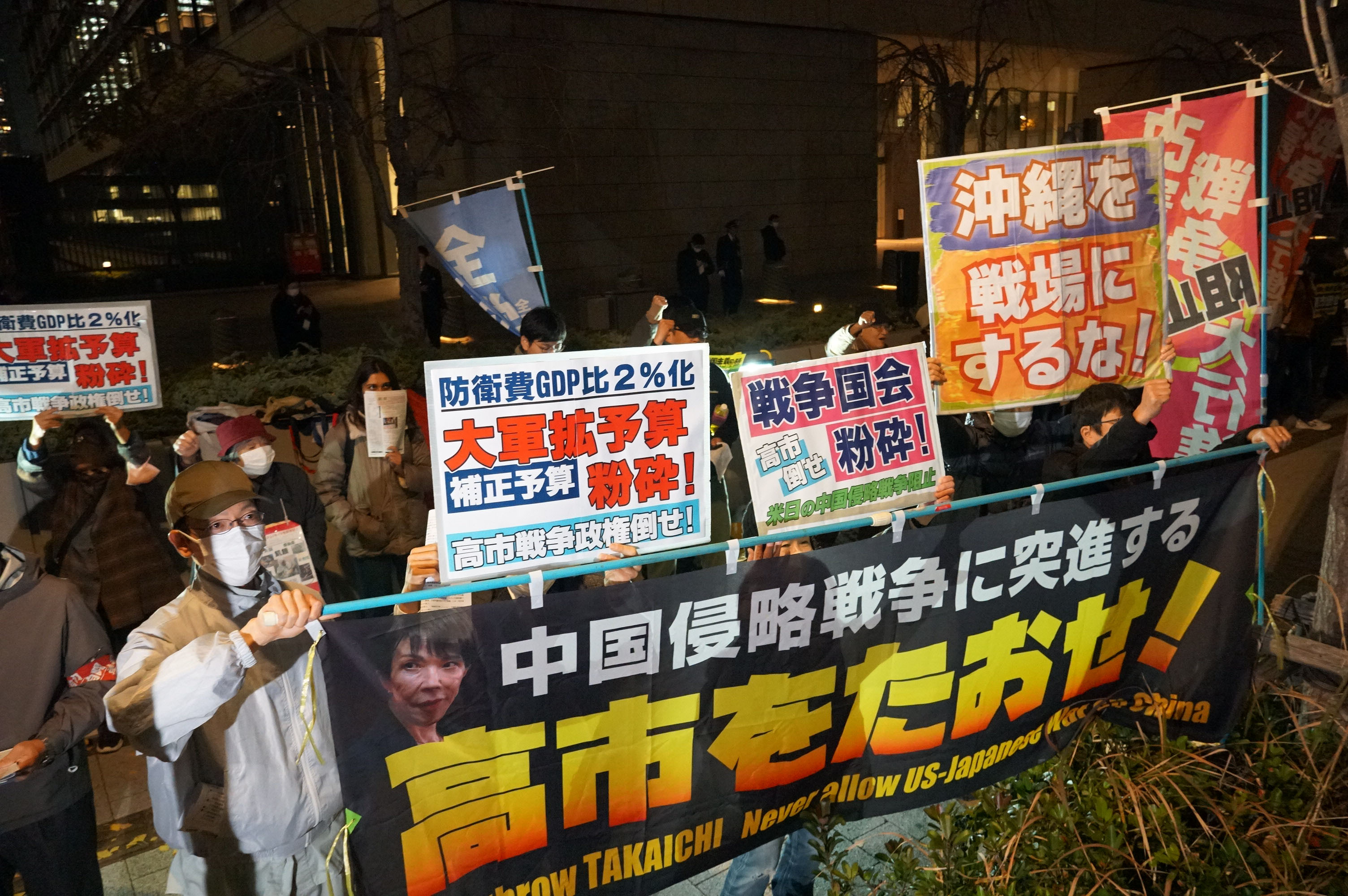 改憲・戦争阻止!大行進東京の呼びかける国会闘争が12月3日夜に闘われ、90人が結集した。高市政権は今年度中に防衛費対国内総生産(GDP)比2%を実現するため、18兆3千億円の補正予算案を11月28日に閣議決定し、12月8日からの審議で成立させて中国侵略戦争への本格的突入を狙っている。これに対して大行進は「補正予算粉砕・中国侵略戦争阻止・高市打倒」の怒りをたたきつけ、12・23新宿デモをはじめ連続的な12月決戦への総決起を誓いあった。