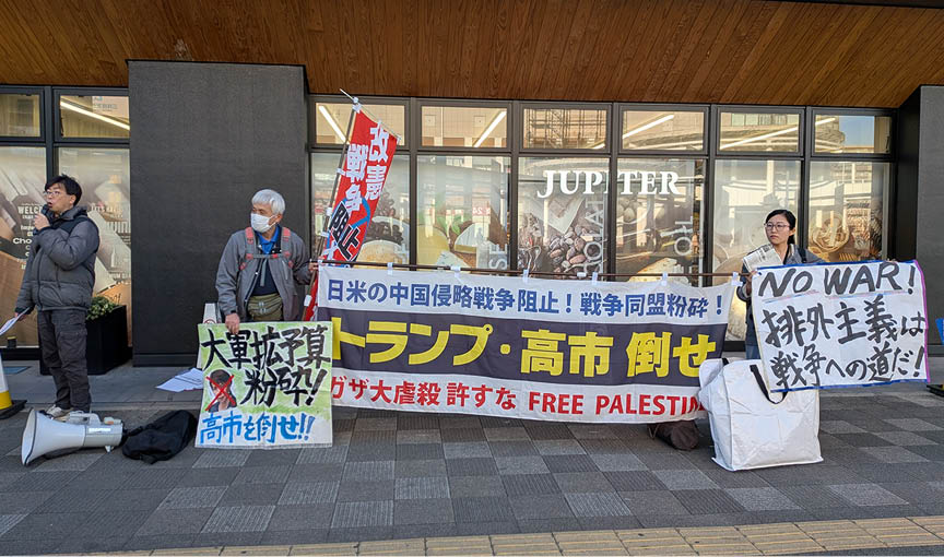 「生きられない社会をつくってきた原因は中国でも外国人でもない! 非正規職を増やし、社会保障を解体してきた自民党政権であり、戦争でしか延命できない資本主義体制だ。うそとデマをまき散らし、労働者を中国侵略戦争へ動員する高市政権を打倒しよう」。この渾身(こんしん)のアジテーションが響く中、駅前は右翼・埼玉県警、これに対する抗議の市民・討論する高校生・署名に応じる人々などが入り乱れ、一挙に政治空間と化した。
