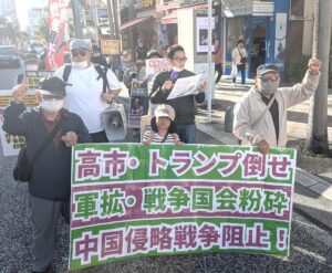 沖縄でも11月28、29日に中国侵略戦争阻止、安保粉砕・全基地撤去、高市・トランプ打倒の反戦スタンディングとデモを闘い抜きました。高市の「存立危機事態」発言などすさまじい排外主義が扇動される中、改憲・戦争阻止!大行進沖縄はほぼ毎週、夕方に那覇の県庁前で街宣を行い、闘いを組織してきました。今回の行動は、防衛相・小泉の先島諸島「視察」や、辺野古・大浦湾埋め立て開始に対する人々の怒りと固く結びつくものとなりました。