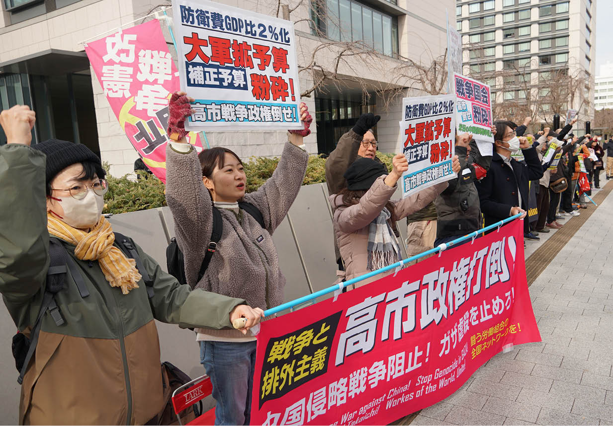 改憲・戦争阻止!大行進東京が呼びかける国会闘争が70人の結集で12月11日午前に闘われた。高市政権はこの日、大軍拡の補正予算案を衆院で採決した。8日に審議入りしてからわずか3日での採決に与野党が合意し、国民民主党、公明党も賛成に回った。中国侵略戦争のための軍事費大増額を誰一人として争点にしない戦争翼賛国会に怒りを爆発させ、「米日の中国侵略戦争阻止」「戦争国会粉砕」「高市打倒」の怒りの声をたたきつけた。