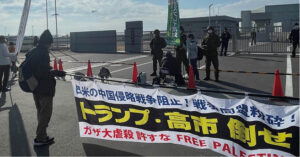 この日の抗議行動でも年度内強行が狙われる熊本県・健軍駐屯地への長射程ミサイル(12式地対艦誘導弾能力向上型、推定射程1千㌔メートル超)配備に反対する闘い、大分県・大分分屯地(通称・敷戸弾薬庫)への物資搬入阻止の闘いなどと連帯し、九州における大軍拡を阻む闘いの意義を訴え、立ちはだかる自衛隊員に「再びの中国・アジア侵略の銃を取るな!」と反戦決起への合流が呼びかけられました。