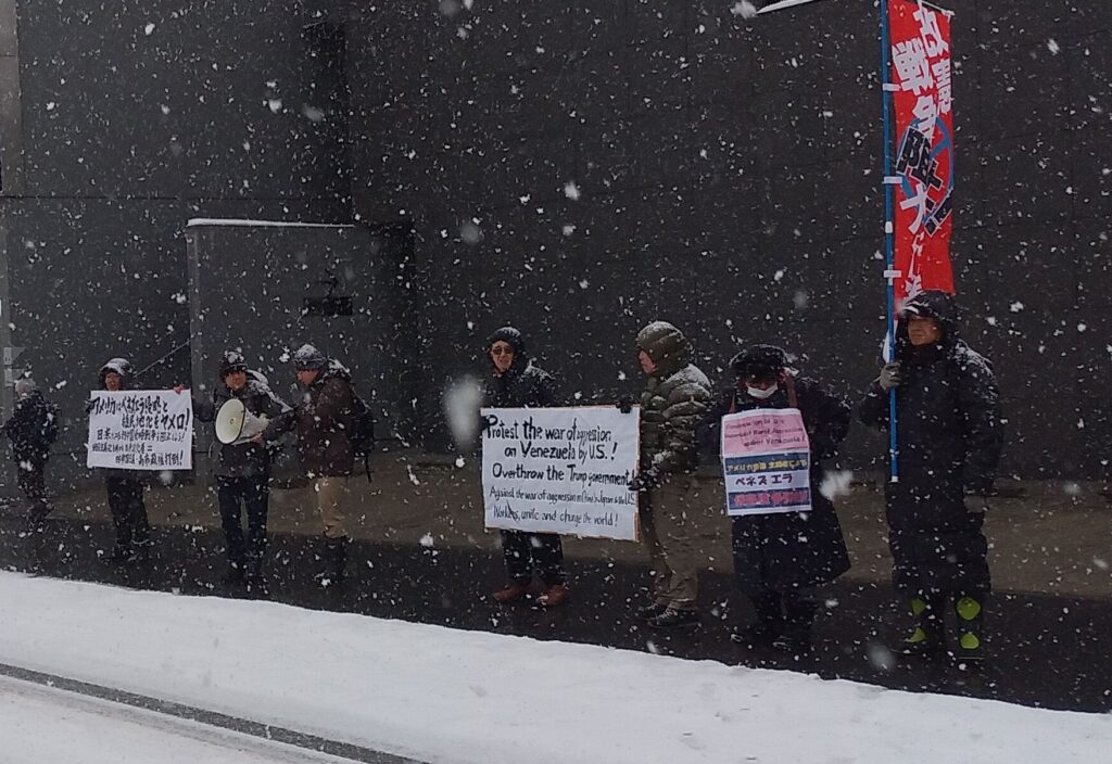1月7日、改憲・戦争阻止!大行進・北海道は、札幌市のアメリカ領事館に赴き、米帝国主義・トランプによるベネズエラ攻撃に対する緊急行動を行いました。3日の暴挙に対して、青年から抗議行動に取り組むべきだとの提案があり、それに応えて10人の仲間が結集。降りしきる雪の中、自交総連SKさくら交通労組の河野晃興委員長が抗議文を読み上げました。