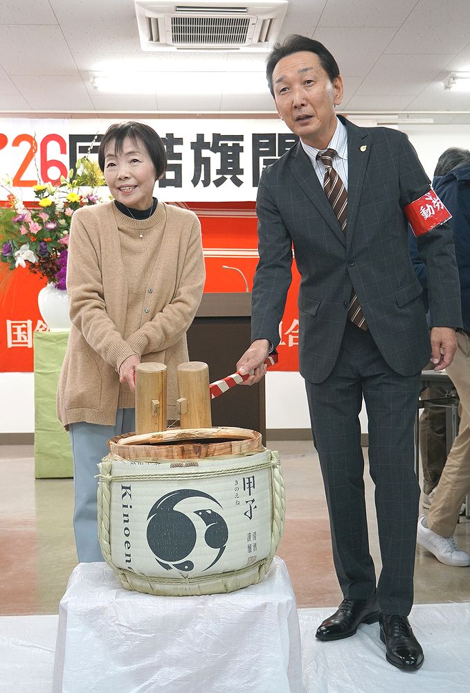 動労千葉家族会の佐藤芳子会長が動労千葉を支えて闘うと表明した後、関委員長とともに鏡開き。OB会の永田雅章会長が乾杯の音頭を取り、組合員と支援は杯を傾けて交流を深めた。
