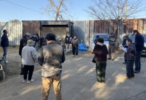 一斉行動出発前に反対同盟会議室前で朝の打ち合わせを行う(1月18日 成田市天神峰)