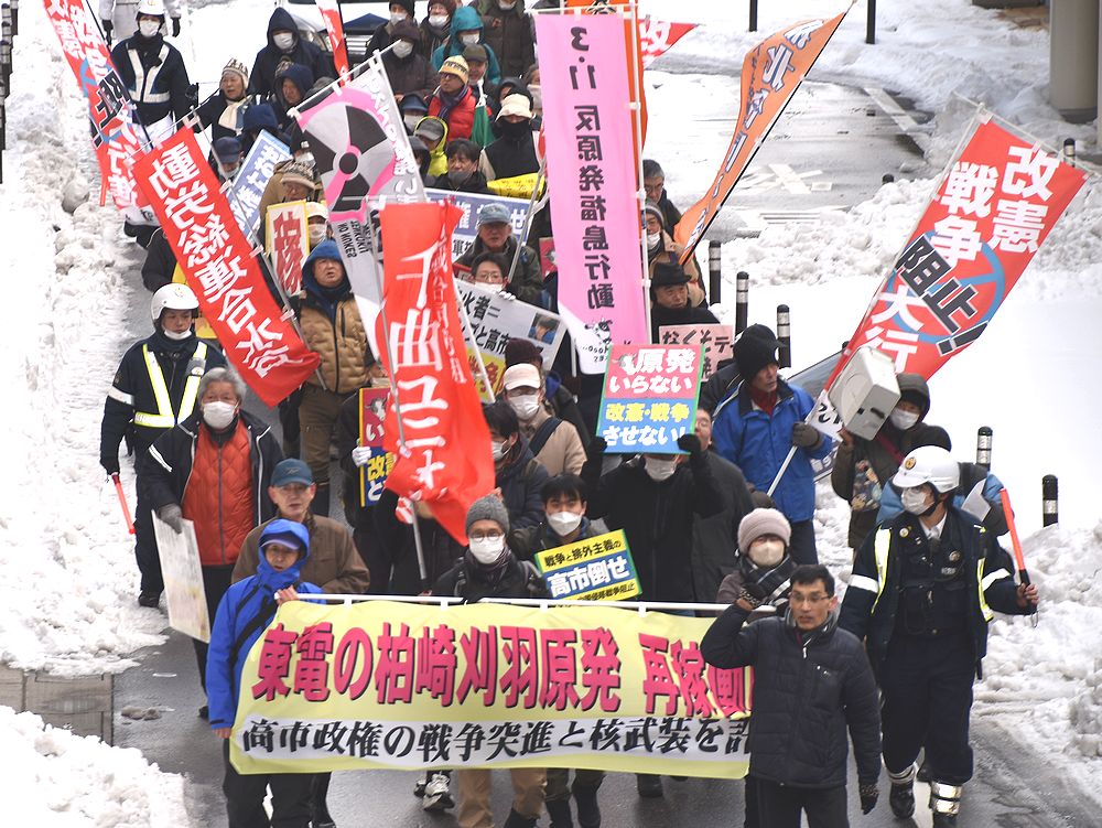 改憲・戦争阻止!にいがた大行進の呼びかけで1月25日、県内と隣県や首都圏から90人が結集し、柏崎刈羽原発の再稼働絶対反対の集会とデモ行進を新潟市内で行った。今冬一番の寒さの中での再稼働反対デモは大きな注目を集め、沿道からの声援も多数あった。