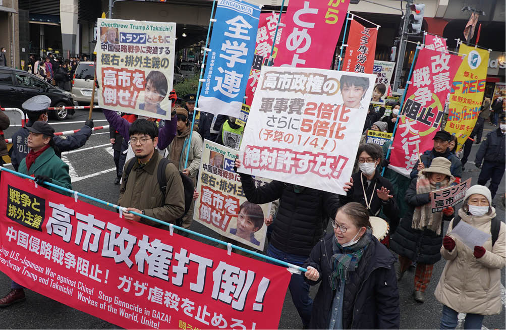 総選挙の「勝利」をもって中国侵略戦争へと突進する高市政権に対し、内乱の時代の到来を告げる怒りのデモが2月11日、改憲・戦争阻止!大行進杉並の主催で杉並区高円寺で闘われた。右翼が妨害のために宣伝カー20台近くを連ね、まさにアメリカの移民税関捜査局(ICE)のように高市の親衛隊として登場する中で、160人のデモ隊はこれを完全に粉砕して街頭の怒りと結合し、「中国侵略戦争阻止」「高市独裁政権打倒」の声を力強くとどろかせた。