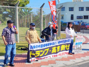 この日、実弾使用の陸上戦闘訓練が開始されるキャンプ・ハンセンの第3ゲート前で、われわれは「中国侵略戦争のための軍事訓練を直ちに中止しろ!」「沖縄戦を繰り返すな!」「全基地撤去・安保粉砕!」「兵士は革命的な労働者人民の隊列に合流しよう!」と、怒りのアジテーションとシュプレヒコールをたたきつけました。