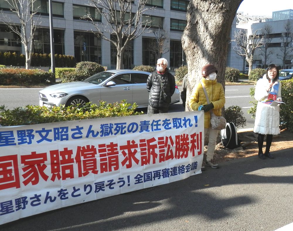 控訴審に合わせて街頭宣伝を行い、星野暁子さんが激しい怒りをもって国の不当性を訴えた(2月13日 東京都千代田区)