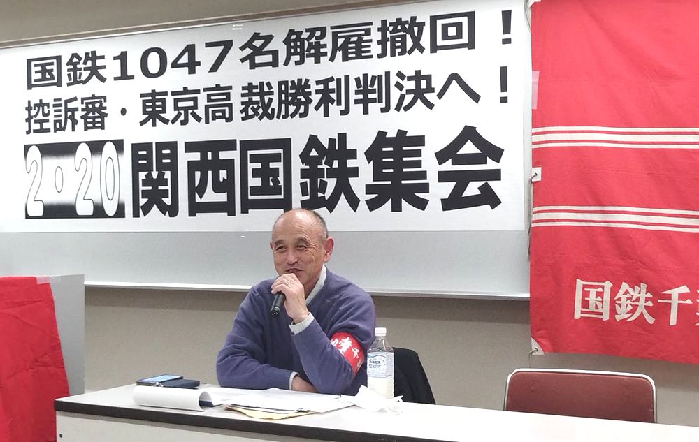 関西国鉄集会が2月20日、動労西日本の主催で会場が満杯となる70人の参加でかちとられました。動労西日本の原田隆司委員長の主催者あいさつの後、国鉄1047名解雇撤回闘争の被解雇者の一人である動労千葉の中村仁副委員長に、「国鉄分割・民営化とは何だったのか」「どうして動労千葉は40年間、解雇撤回闘争を闘い続けることができたのか」「1・23裁判の勝利を切り開いた力は何か」ということについて、話していただきました。