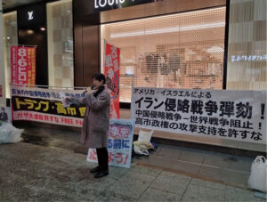 「アメリカ帝国主義とイスラエルによるイラン攻撃を許すな!」「イラン攻撃は中国侵略戦争―世界戦争の一環だ!」「高市政権によるトランプ支持は許せない!」との訴えに、多くの労働者や学生、市民が注目し、ビラを受け取った。アジテーションにうなずいて「その通りだ」と声をかける人や、「高市はダメだ! がんばれよ!」と仲間を激励する人などが現れた。世界大戦、核兵器を使うのではと不安げに話す女性もいた。広島の労働者人民は心底からイラン空爆に怒っていると確信できた。