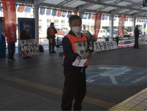 雇い止め撤回・イラン侵略戦争弾劾を訴え木村書記長を先頭に熊谷駅前で宣伝行動(3月21日 埼玉県熊谷市)