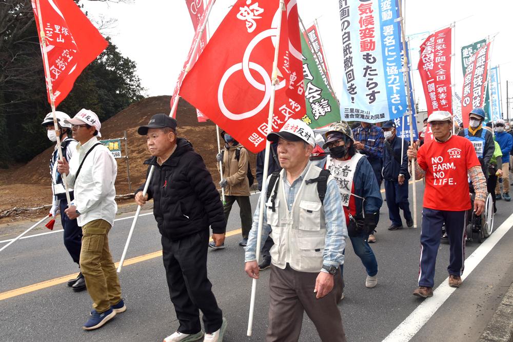 両側に畑と住宅が広がる県道62号線(芝山はにわ道)を南下し、左折して細い生活道を経て、県道45号線を北上。活気あふれるデモが町役場前を通過した。このコース一帯は直接の拡張予定地ではないが、第3滑走路が稼働すれば間違いなく殺人的騒音にさらされる。芝山町内に空港敷地が占める面積は、現在の約93ヘクタールから744ヘクタールへと拡大し、実に町の総面積の約6分の1が空港によって削られてしまう。これが地元との「共存共栄」だと言うのか!?