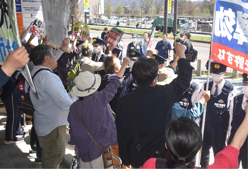 全国からかき集められた大量の警察官により市内に厳戒態勢が敷かれる中、正午前に天皇ナルヒトは家族を伴ってJR福島駅に降り立ち、現地を歓迎ムード一色に染め上げようとした。闘争参加者が市内中心部にある文化施設から駅前情宣に向かおうとしたところ、全く許しがたいことに神奈川県警の警察官が大挙して入り口前に阻止線を張って妨害してきた。「通せ!」「妨害やめろ!」。天皇がいる間は反対者をとにかく外に出さないという無法な暴力的弾圧に怒りが爆発し、「天皇の福島訪問弾劾!」のシュプレヒコールをたたきつけ、1時間にわたる攻防を闘いぬいた。