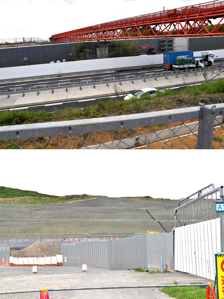 手前に見える東関道付け替え道路にはひっきりなしに車両が往復し、その奥にトンネルとなる構造物(カルバート)が通し番号を打たれて連結されている。すでに大半の足場が撤去され、設置工事は「終わっている」状態だろう。あとはこの一帯を途方もない量の土砂で埋め立て、固めていくことになる。