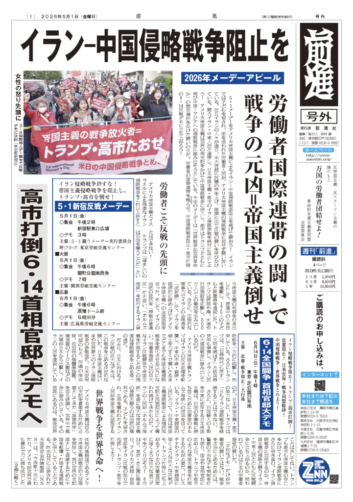 アメリカ帝国主義は世界の再支配をかけて中国侵略戦争に突入し、高市はトランプとともに再び中国―アジアへの侵略戦争に踏み出そうとしている。今年のメーデーは「世界戦争か世界革命か」の歴史選択をかけた闘いの日だ。労働者の国際連帯を甦よみがえらせ、中国侵略戦争阻止・高市打倒の6・14反戦デモに立ち上がろう!