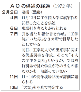 AOは翌年2月2日に逮捕され、4日には工学院大学へ旗竿作りに行ったと供述するが、その際に「大坂」に関する供述はない。その後の供述の経過は左の表を見てほしい。